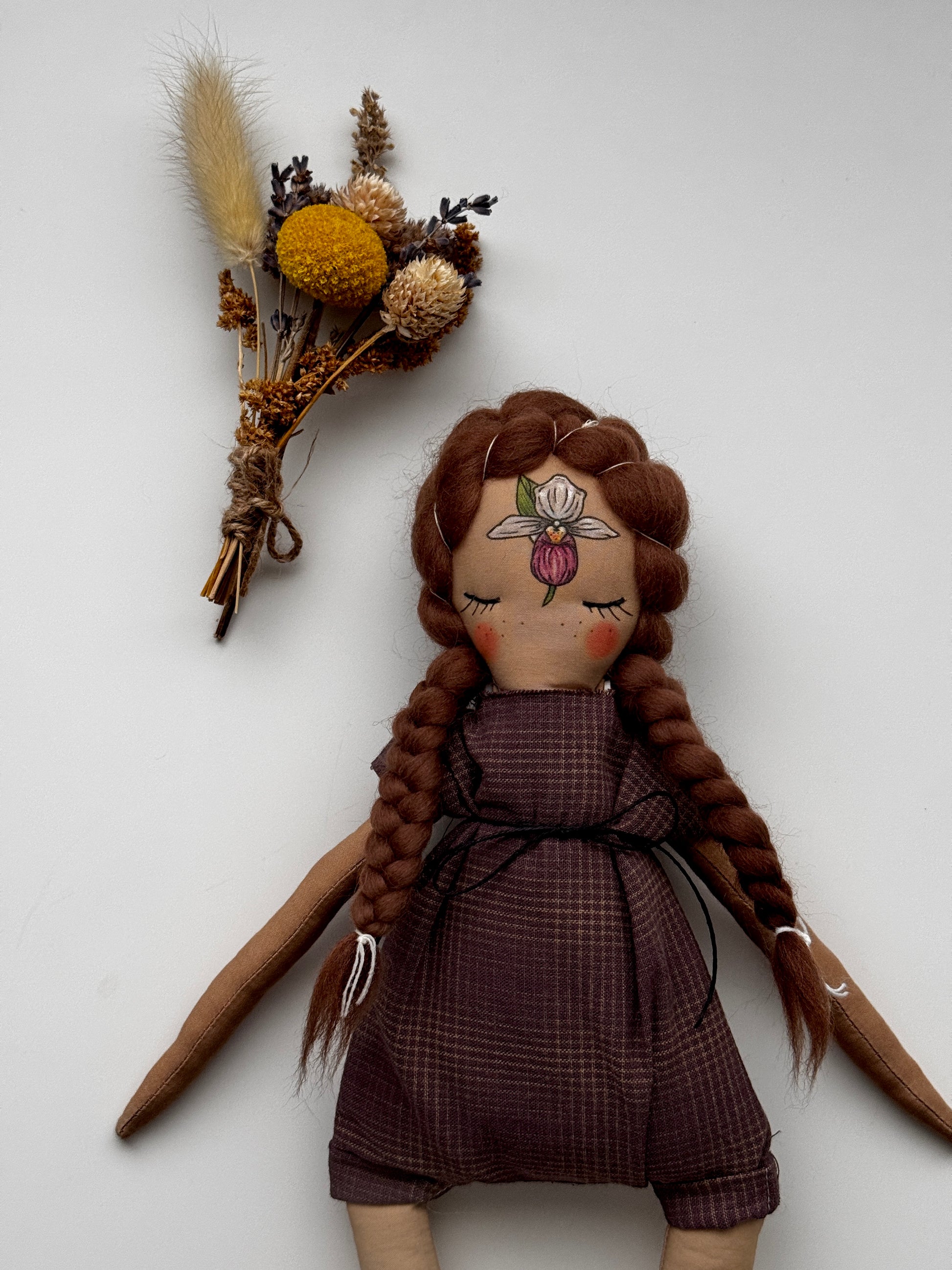 Materials : hand-dyed gots certified organic cotton, plaid woven cotton, merino wool, organic hemp, recycled fiber fill, cotton thread + twine, reclaimed buttons, ink, water color pencils, acrylic fixative