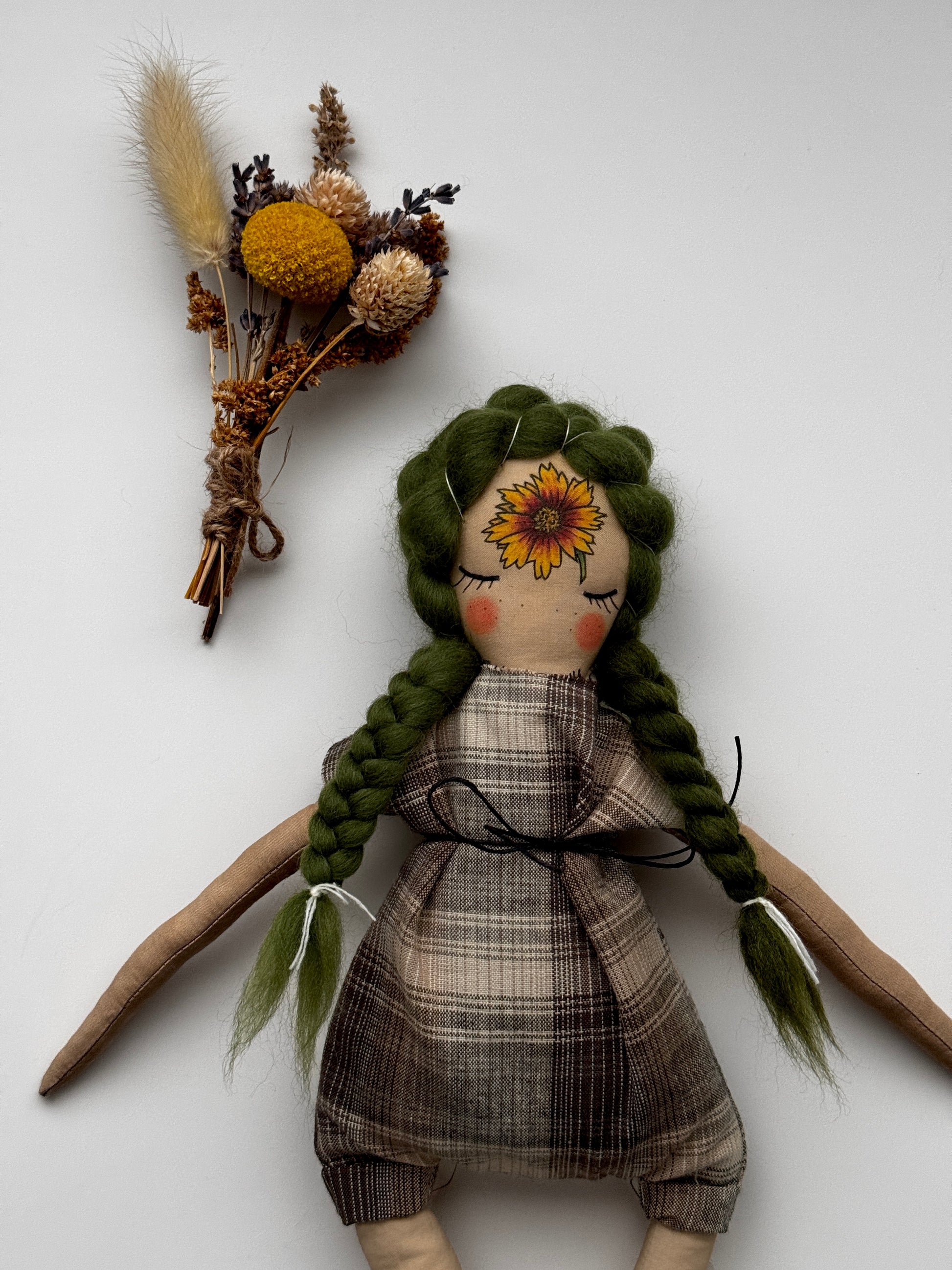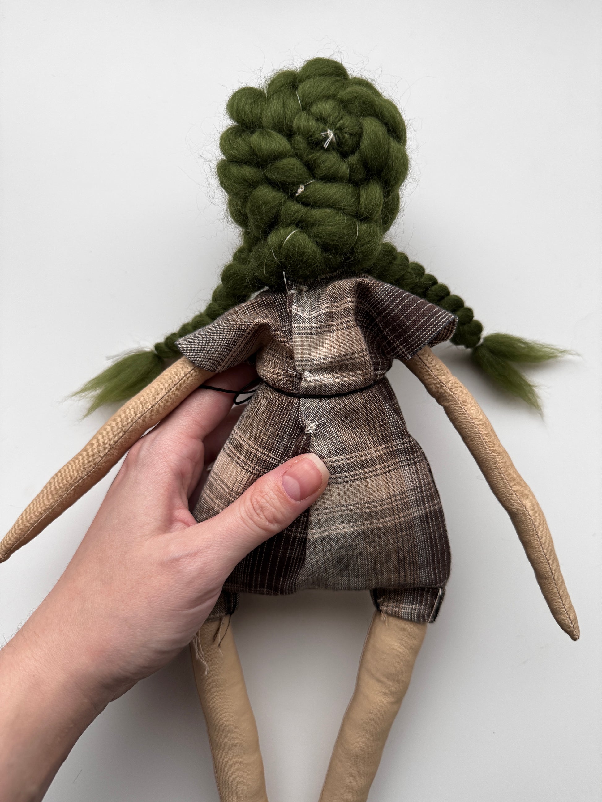 Materials : hand-dyed gots certified organic cotton, plaid woven cotton, merino wool, organic hemp, recycled fiber fill, cotton thread + twine, reclaimed buttons, ink, water color pencils, acrylic fixative